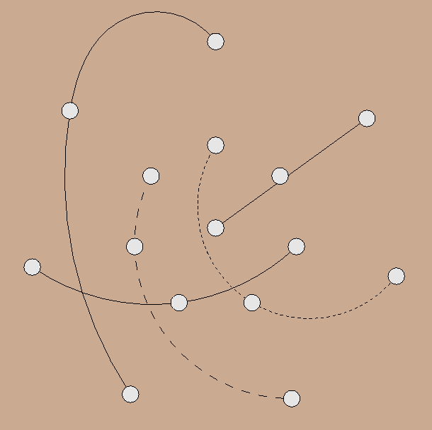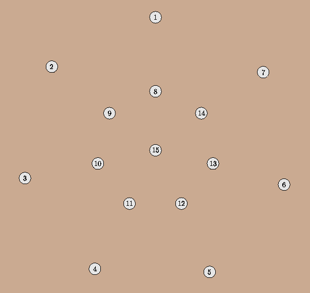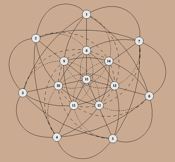 In mathematical language we have a 2-(15, 3, 1) design: our pointset is V = {1, ..., 15} and we consider blocks of length 3 (there are 5 · 7 = 35 blocks). The important property of these blocks is that each pair of points - we have (15 \choose 2) = 105 of them - is contained in exactly lambda = 1 block.