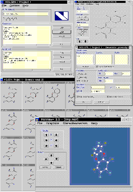 Zusätzliche Möglichkeiten, die MOLGEN bietet, sind das Herausfiltern aromatischer Doubletten, der Export in das weitverbreitete MolFile-Format, die Bearbeitung mit dem eingebauten Struktureditor zur interaktiven Beschränkung des Lösungsraums und die Berechnung räumlicher Plazierungen nach [1].