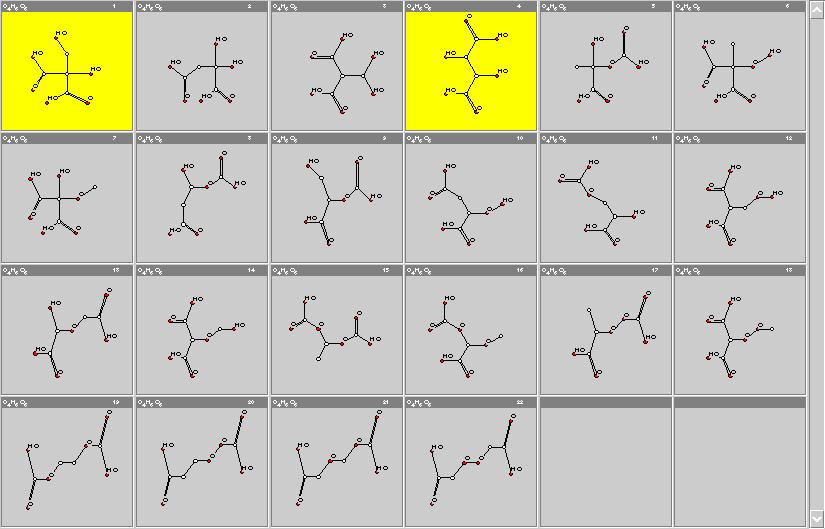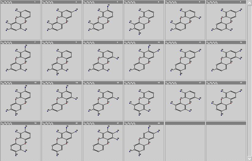 If you enter, for example, the gross formula C12O2Cl4H4 together with the single substructure of the dioxin skeleton (substitutes removed), within a second you obtain from MOLGEN the 22 constitutional isomers of the dioxin that are shown in Figure 4.
